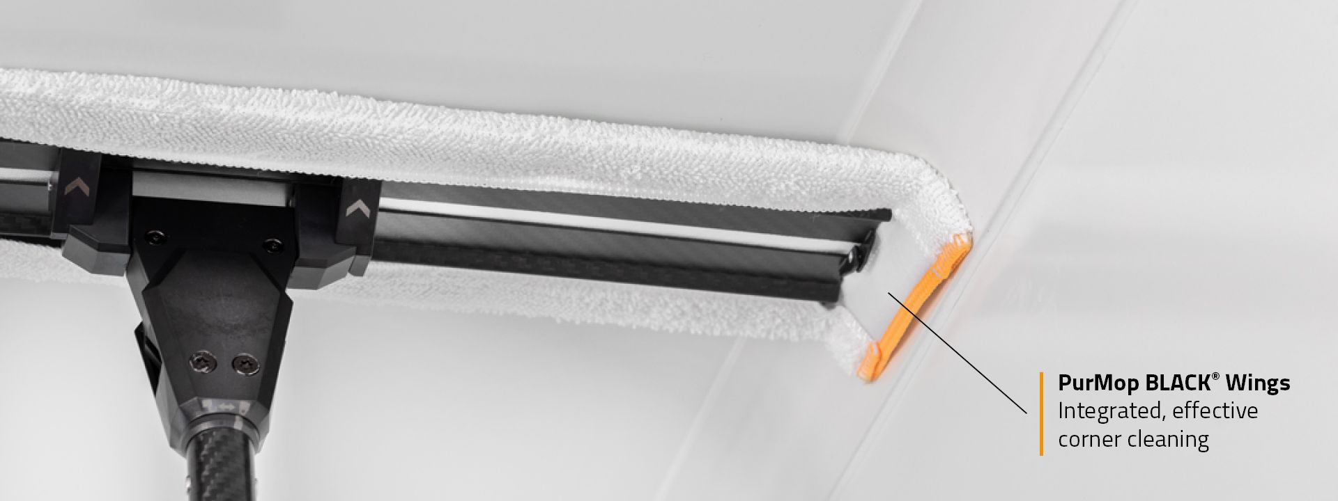 PurMop BLACK® D4 is the latest mop in the Performance Line. It offersall the popular advantages of the new generation of mops, such as increased area performance and integrated corner cleaning. In addition, the D4 is characterised by another special feature: It has specially designed brush strips. This means that the front material of the D4 consists of a combination of microfibre and harder scrubbing fibers. This effectively removes dirt and residues and then retains it safely in the microfibre material. The clever combination of innovative materials makes the D4 highly efficient and further improves ergonomics while mopping. Best of all, the D4 is suitable for everyday cleaning. PurMop BLACK® D4 is also available in a sterile version.