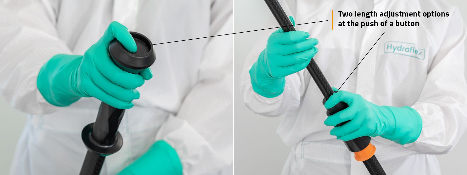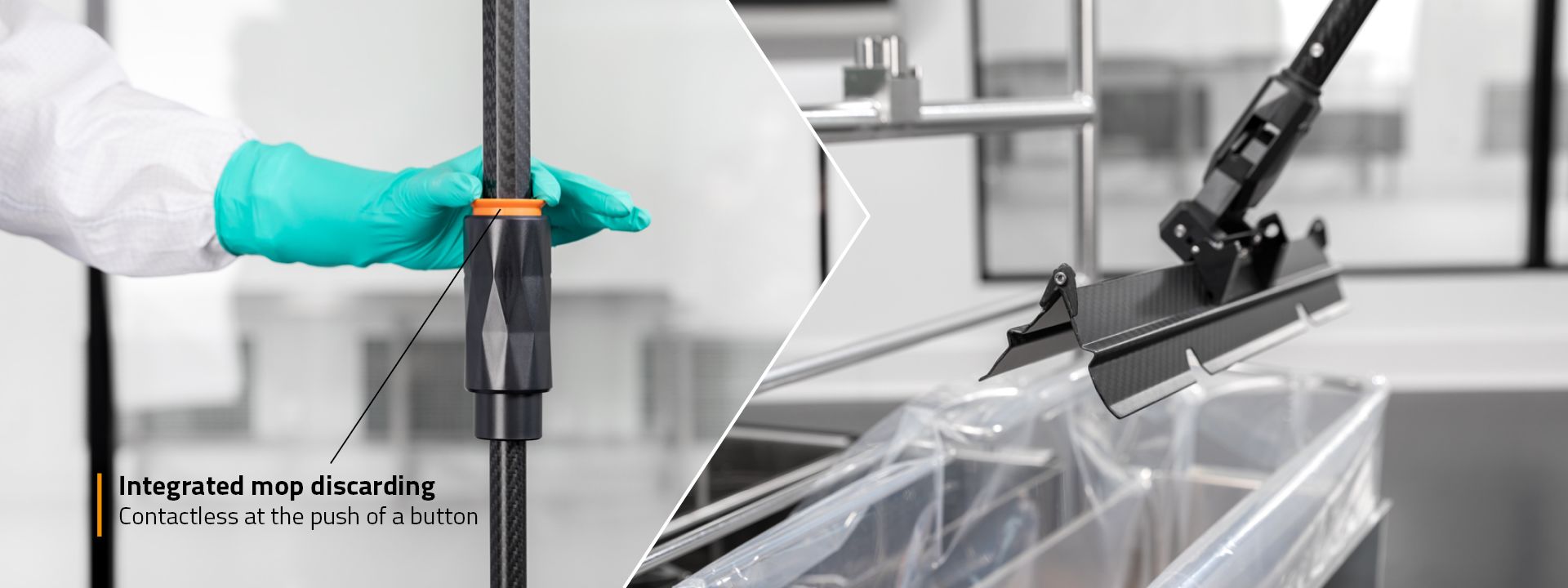 PurMop BLACK® C1 is a unique cleanroom mopping system, offering maximum performance and unparalleled user experience. Its telescopic handle and frame are made from carbon fiber reinforced plastic (CFRP), making it ultra light. The complete C1 system weighs only 650 g, arguably making it the most ergonomic cleanroom mop available on the market. Length adjustment can be performed using one hand only, at the push of a button either at the top or middle of the handle. A newly developed frame centring function facilitates safe overhead cleaning by preventing the frame from folding unwantedly. A further intelligent feature is the mop discarding mechanism, allowing the frame to be opened and the mop to be dropped at the simple push of a button – anywhere and without the need for a trolley.